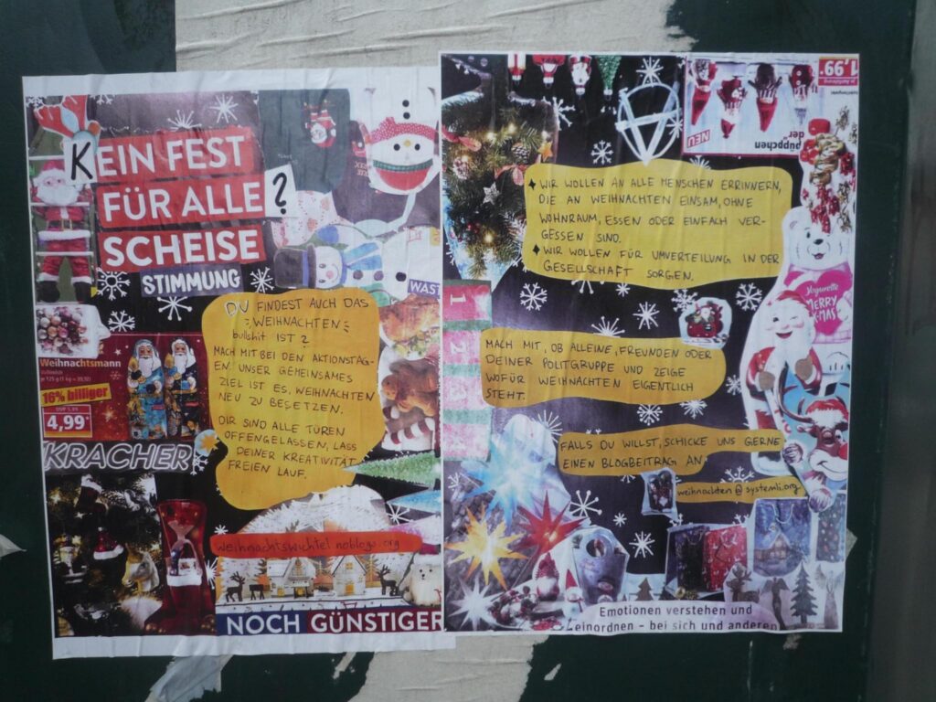 Die Plakate handeln davon, dass Weihnachten bullshit ist. Aber warum wird das Fest der Liebe kritisiert? Das Fest des Gebens und des Schenkens. Die Antwort liegt natürlich auf der Hand: Kapitalismus. Weihnachten ist der Peak des Konsumwahns der Verdrängungsgesellschaft. Das möchten Wir ändern! Wir wollen nicht, das sich Menschen mit Billigzeug überhäufen, dass schlimmstenfalls dann noch in irgendeinem Ozean landet. Wir wollen Weihnachten eben neu besetzen, wie es auch auf den Plakaten steht. Und das bedeutet eine solidarische, lebenswerte Gesellschaft für alle Menschen (und Wichtel), nicht nur für diejenigen, die die Ellenbogentaktik beherrschen. Wie so eine Utopie aussehen kann, da gibt es verschiedenste Bücher dazu. Zum Beispiel ‚Utopien für Realisten‘ von Rutger Bregmann, ‚Anarchy Works‘ von Peter Gelderloos, oder in Romanform von der Autorin Ursula Le Guin.